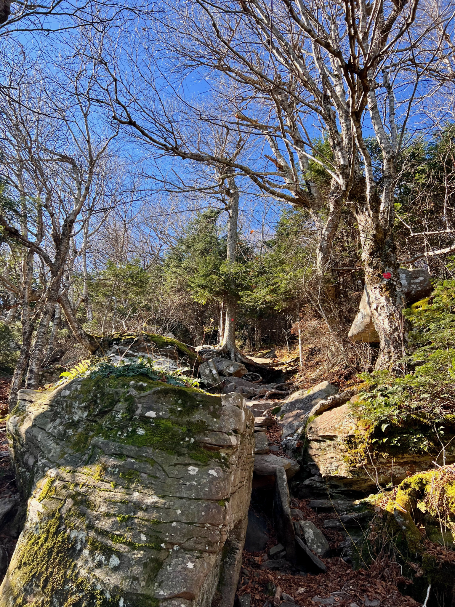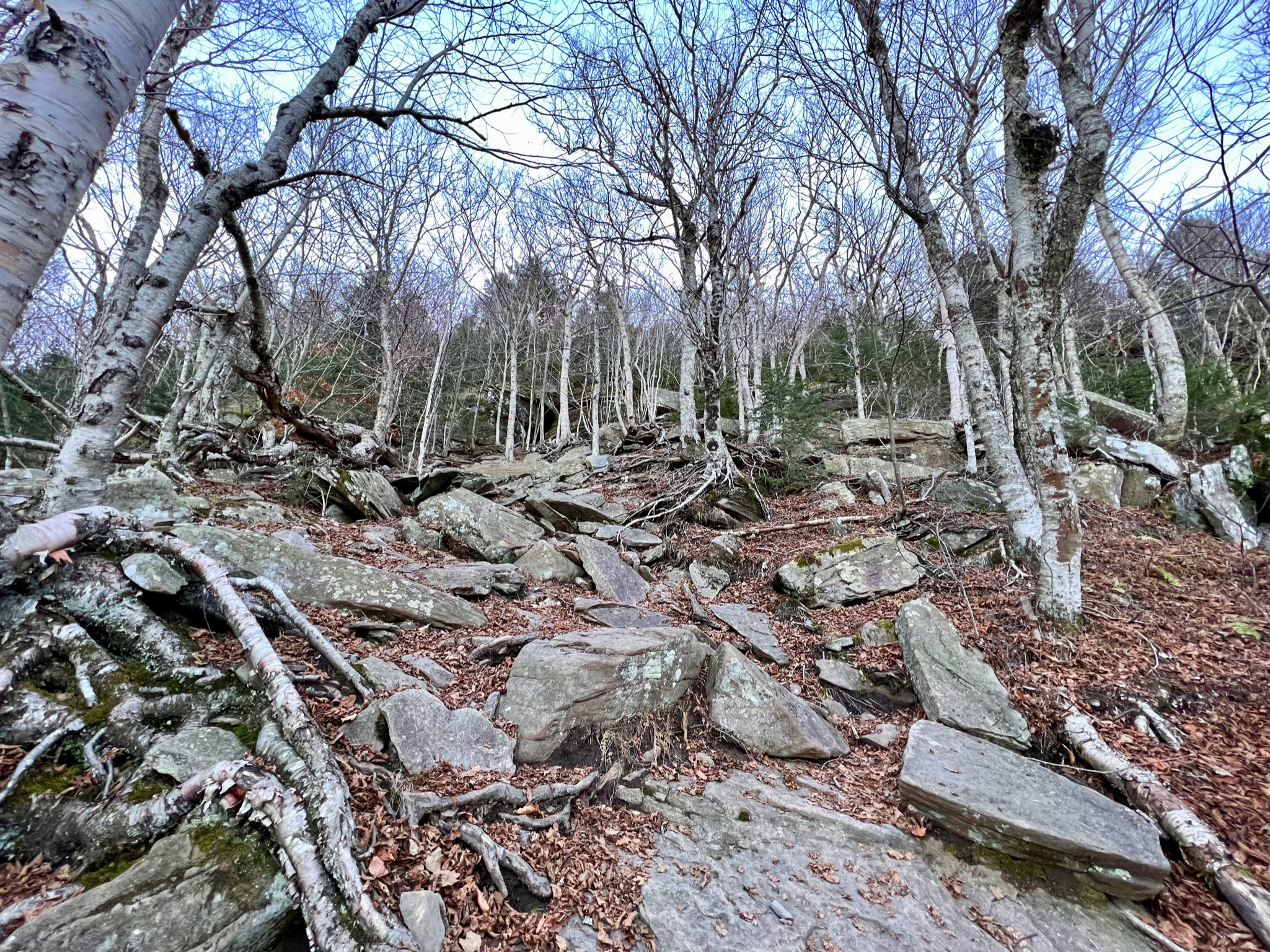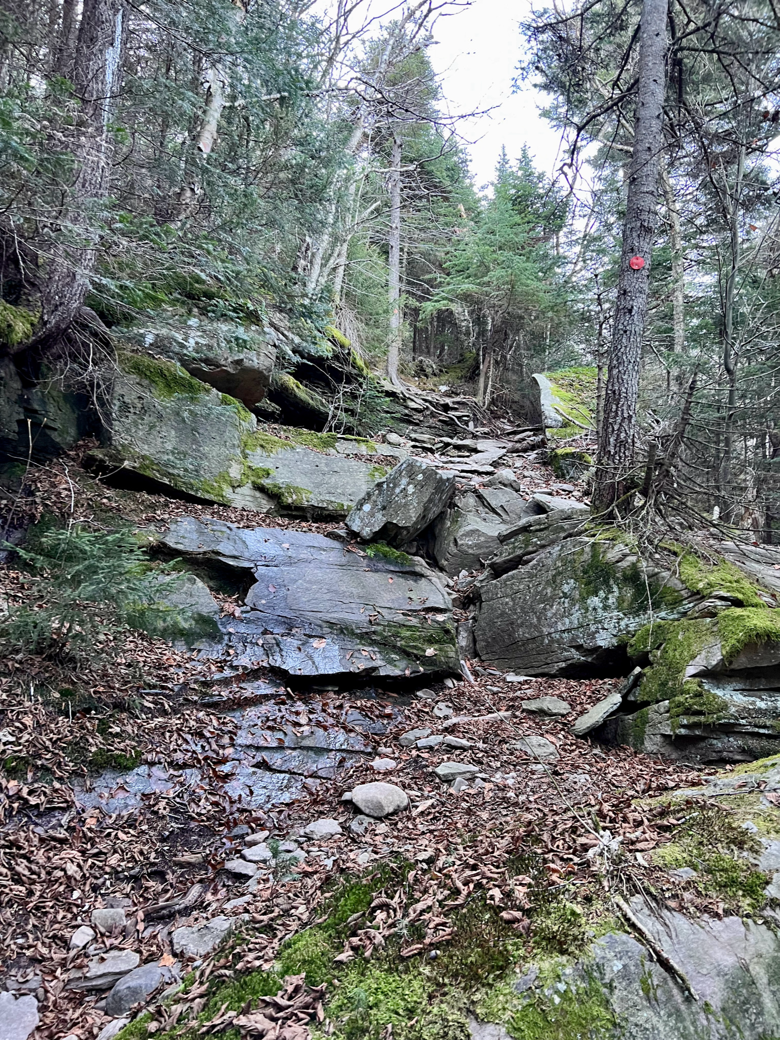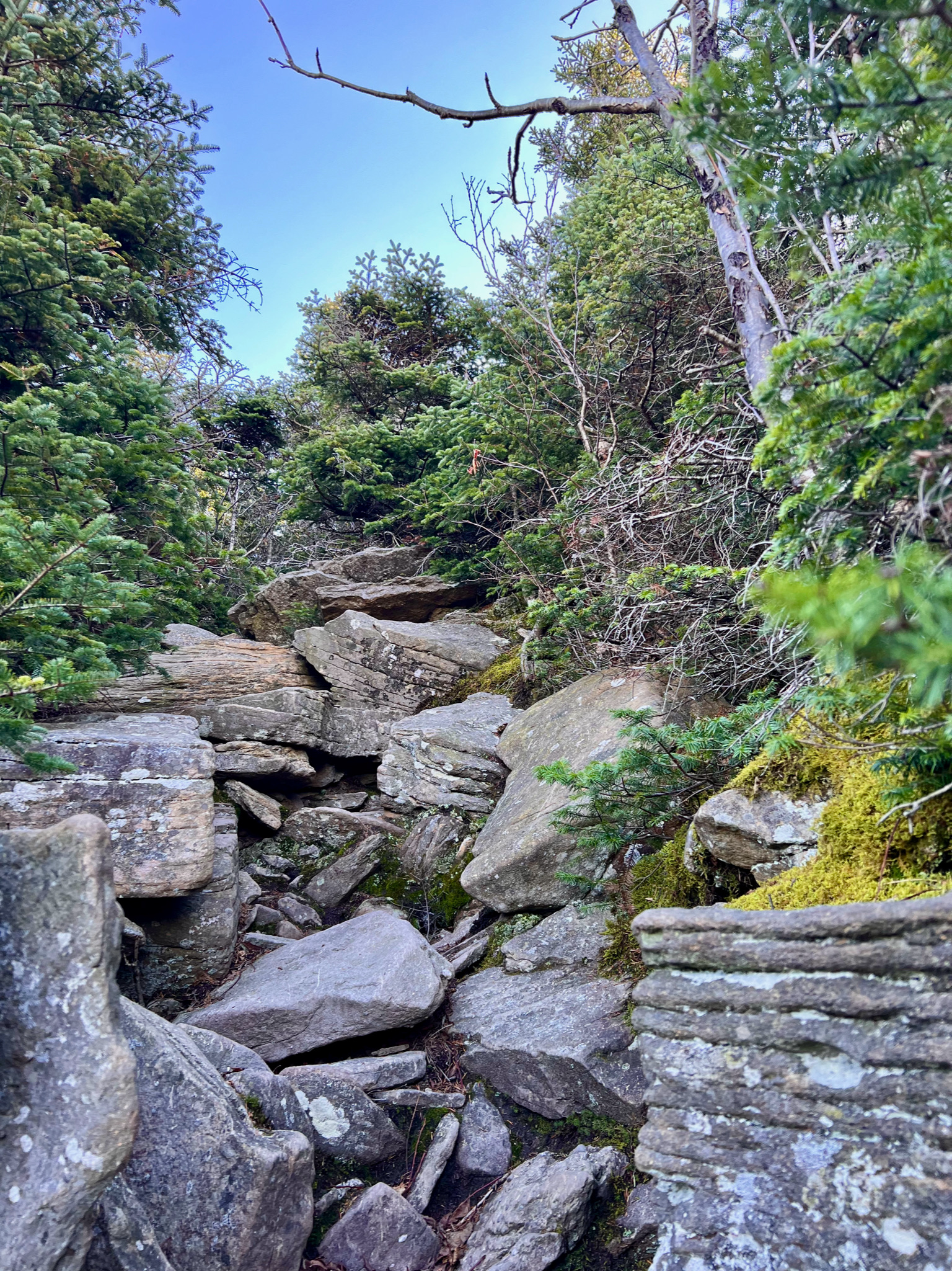 And then, having finally descended from Twin, and passed “Jimmy Dolan’s Notch”, the forest levels out somewhat, though it still remains rock and root-strewn.