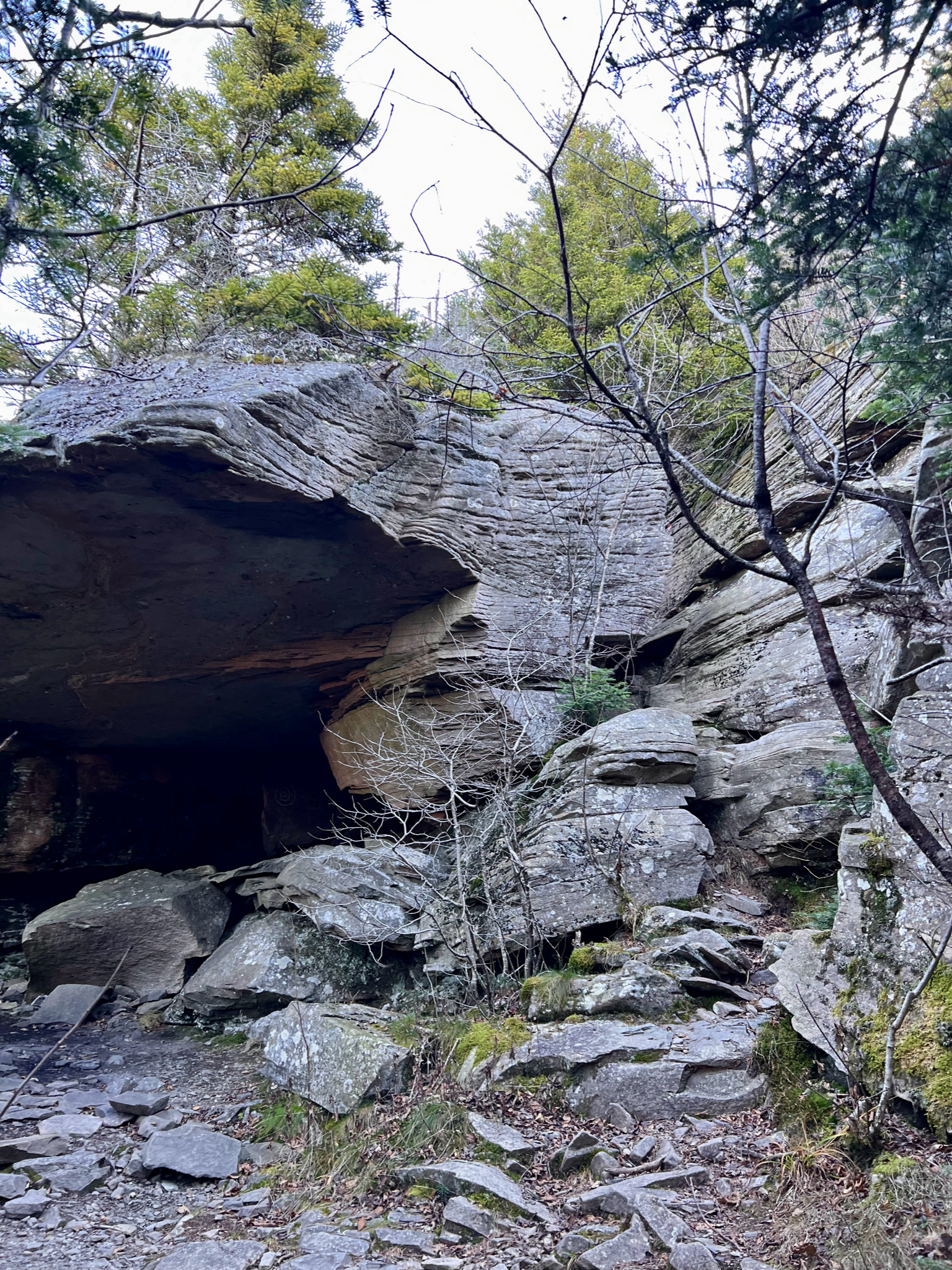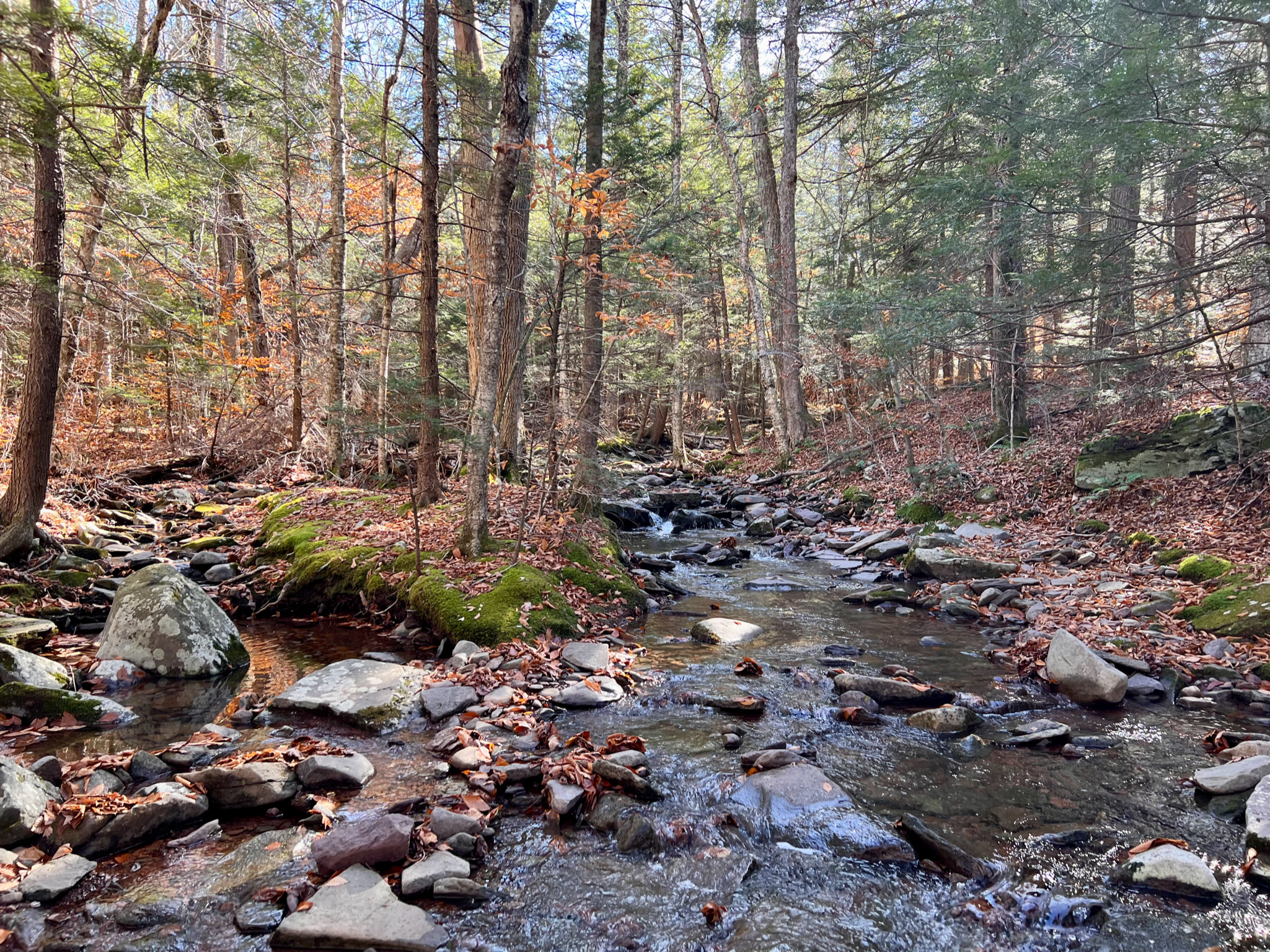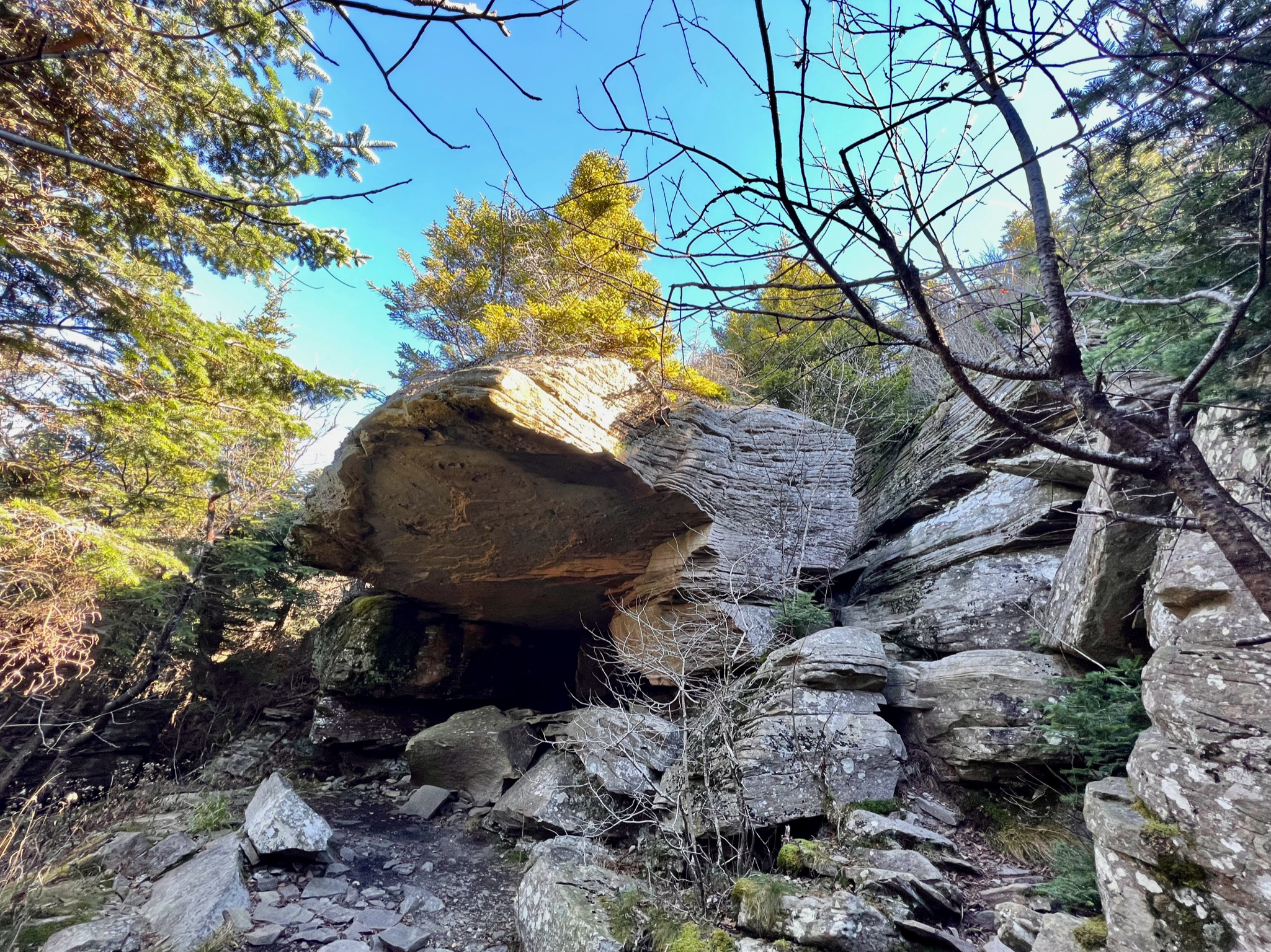 Descending into Mink Hollow the sun was already going down, casting long shadows, while still illuminating Plateau Mountain, further to the west.