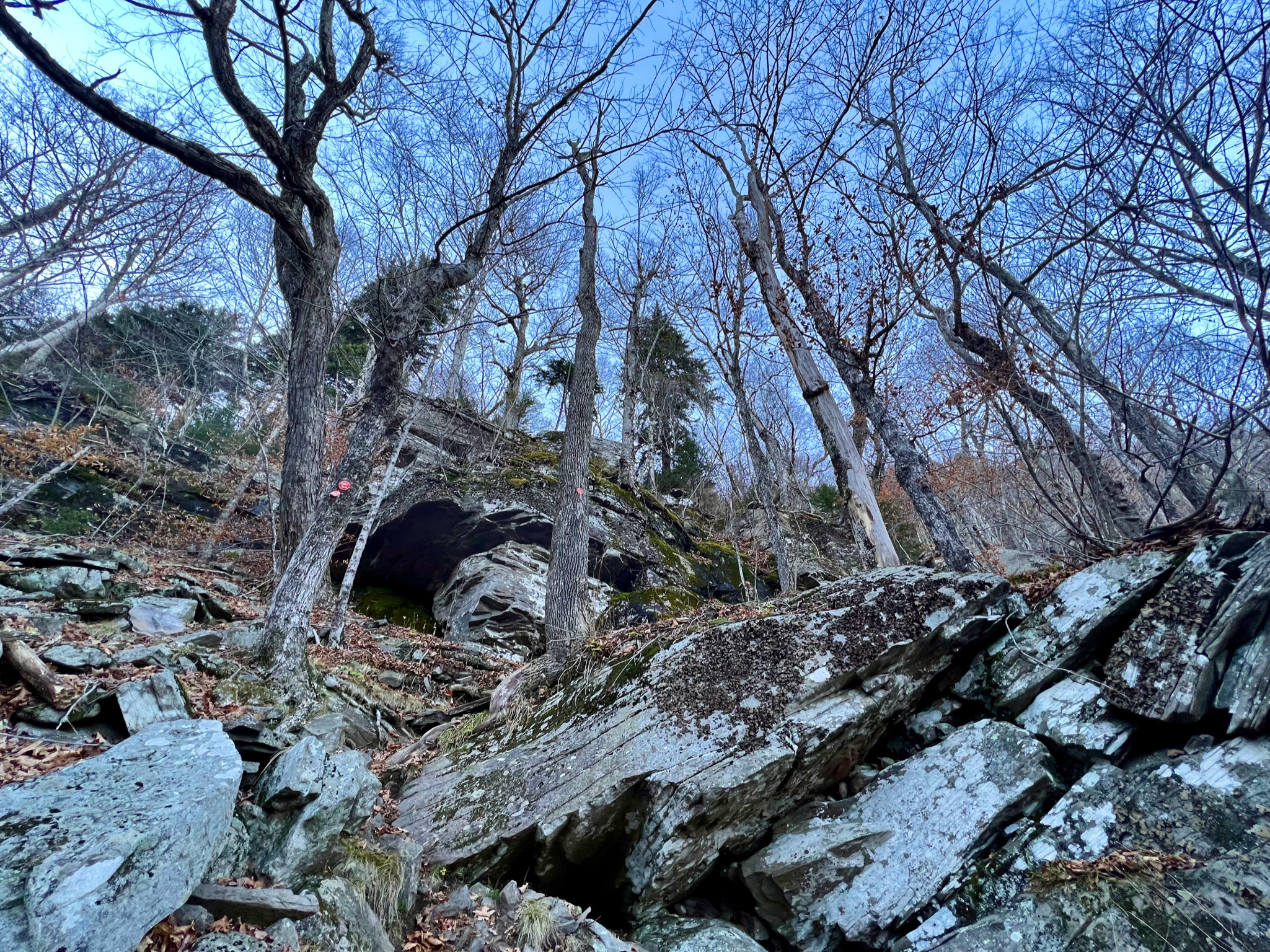 You can see on the image of my topo map below the blue route I took from Prediger Road up and over Twin, then down, then up and over Sugarloaf, then down into Mink Hollow, where I camped. It’s about 6 miles each way, with vertical gain around 2,600 feet – which isn’t much in terms of pure gain or mileage, but is challenging because much of it comprises rock scrambles, with no real navigable trail (despite trail blazes intermittently marking rock scrambles, as you’ll see in photos below).