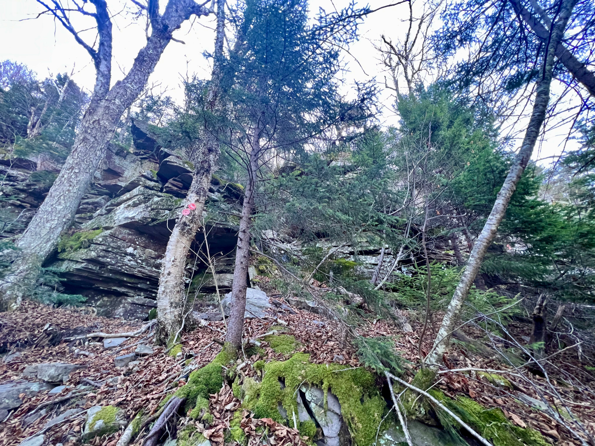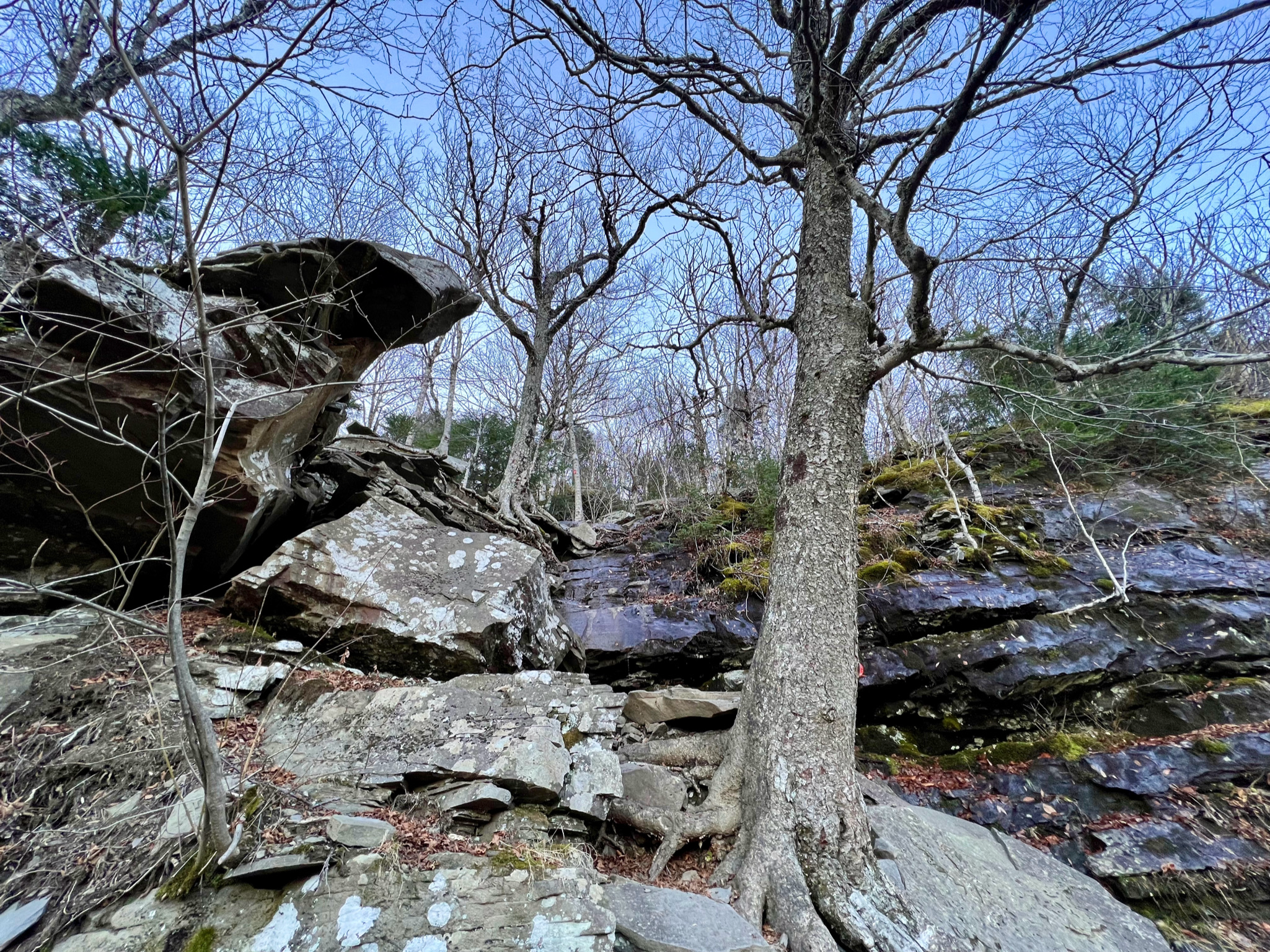 I was on the road at 7am on Saturday, arriving at the trailhead around 9:15am. Day hikers were already arriving, but few if any of them could offer me any trail beta. Back in summer of 2020 we had been to this trailhead when we stayed in Saugerties, when the kids hiked Twin and Indian Head (alone!) – the drive up Platt Clove Road to the trailhead is so dramatic, and it was great being back. The weather was clear and cool, probably around 40F, but promising to go up into the 60s. I had three routes to choose from, but I arrived already wanting to hike up over Sugarloaf, which has the reputation of being the hardest mountain of the Catskill 3500 high peaks, and also comprising part of the infamous Devil’s Path. Neither the mileage nor the vertical gain were huge, but I suspected the climbing would be challenging. My one concern was being able to hike out by noon on Sunday.